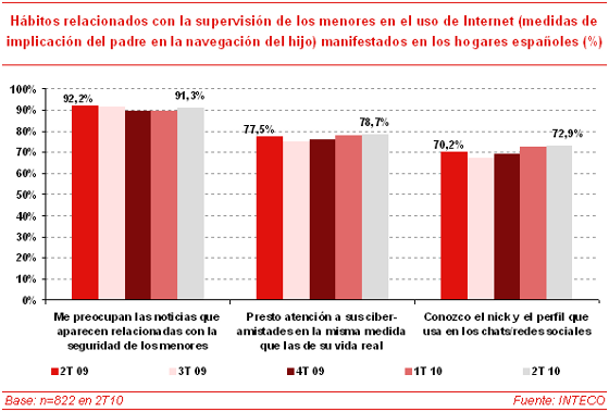 - Presto atención a sus ciber-amistades en la misma medida que con sus amistades en la vida real. Este valor se ha incrementado en 1,2 puntos porcentuales desde el segundo trimestre de 2009 hasta alcanzar en esta última lectura un valor de 78,7%, lo que indica que cada vez son más los padres que comprenden la importancia del entorno virtual en la vida de sus hijos.