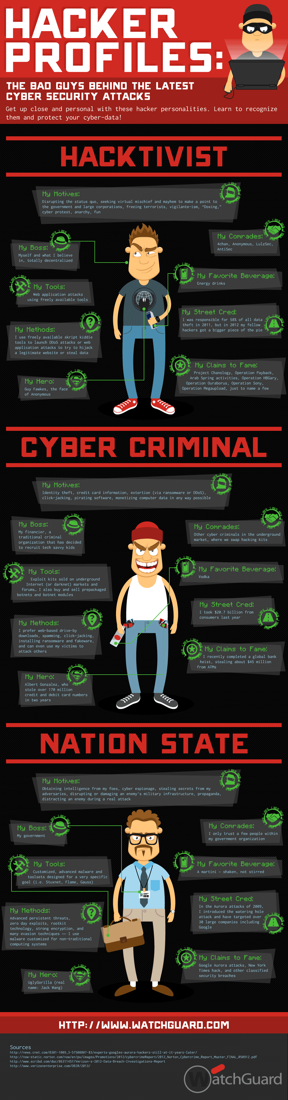 «Los tres tipos malos que están detrás de los últimos ataques de ciberseguridad» es una infografía publicada por WatchGuard en la que distinguen a los tres tipos de hackers que más están dando que hablar por sus acciones: el que busca reivindicar algo, el que busca dinero y el que quiere controlarlo todo… Es decir, el hacktivista, el cibercriminal y los gobiernos de turno.