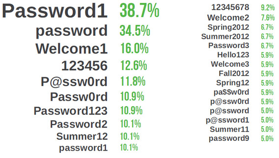 La lista de términos usados en contraseñas en empresas es asimilable a la utilizada en el mercado informático de consumo y lo mismo de insegura. Y ello a pesar de la mayor información y preocupación sobre robos de identidad o de cuentas con unas contraseñas que son las primeras en probar por cualquier sistema o atacante sin necesidad de utilizar técnicas especiales.