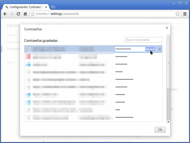 Todo el mundo lo sabe -o debería saberlo-, pero por si acaso, aquí la explicación de los que hablamos: en las opciones de Google Chrome es posible acceder a las contraseñas que guarda el navegador. Tan sencillo como eso. Pasa lo mismo en el resto de navegadores excepto Opera, pero a diferencia de Chrome, lo normal es ofrecer también una opción de contraseña maestra, que cifre el acceso al gestor de contraseñas. El problema es que esto casi nadie lo utiliza luego.